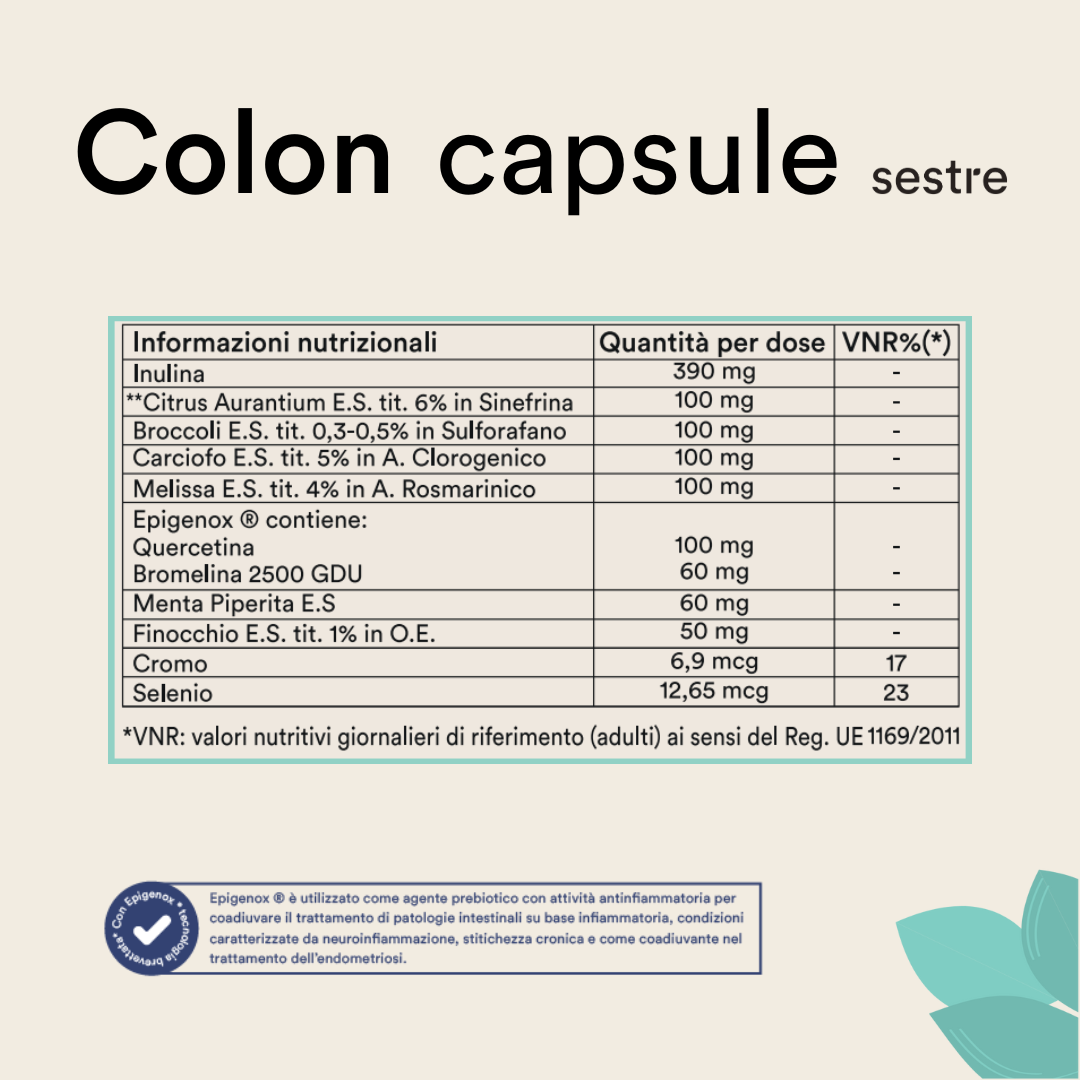 Colon è un integratore nutraceutico in capsule che attraverso ingredienti naturali presenti nella Dieta Mediterranea permette di raggiungere il giusto equilibrio intestinale. Le sostanze nutrizionali presenti in Colon aiutano a regolarizzare il transito intestinale contrastando la stitichezza. La presenza dell’estratto secco di Arancia Amara e Finocchio lo rende il miglior integratore per dimagrire e per avere la pancia piatta contrastando il gonfiore. Inoltre migliorando l’equilibrio del microbiota intestinale, favorisce il rinforzo delle difese immunitarie e l’equilibrio ormonale.