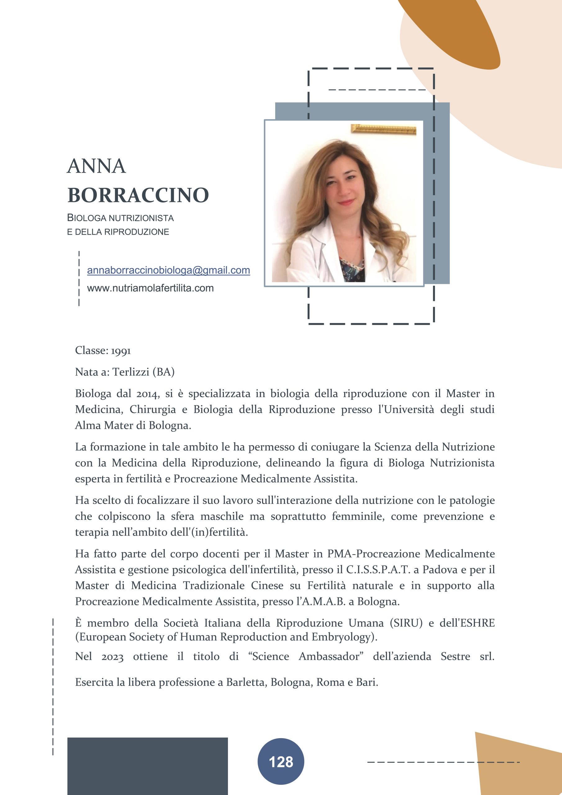 La Dott.ssa Borraccino è biologa nutrizionista con un Master in Medicina, Chirurgia e Biologia della Riproduzione.